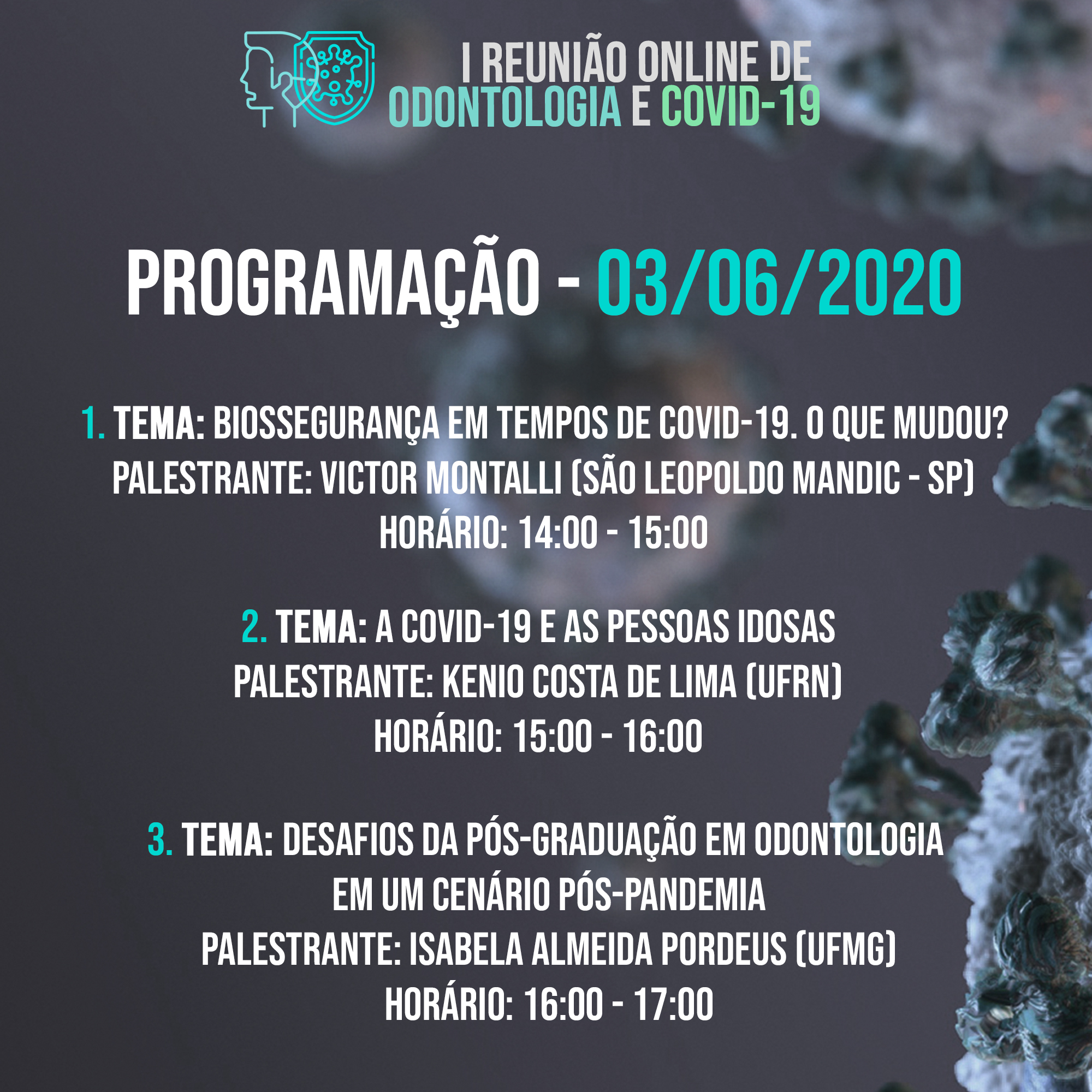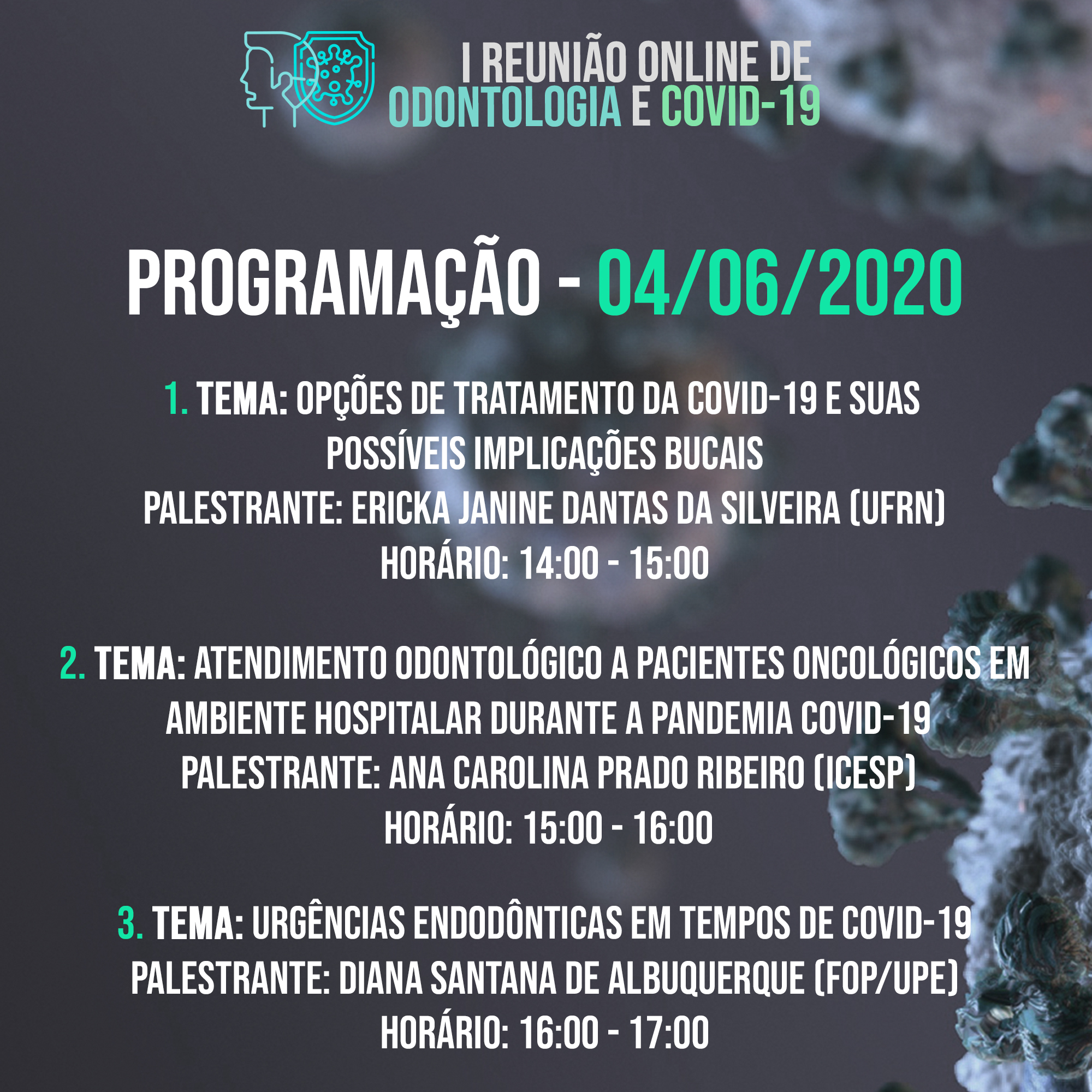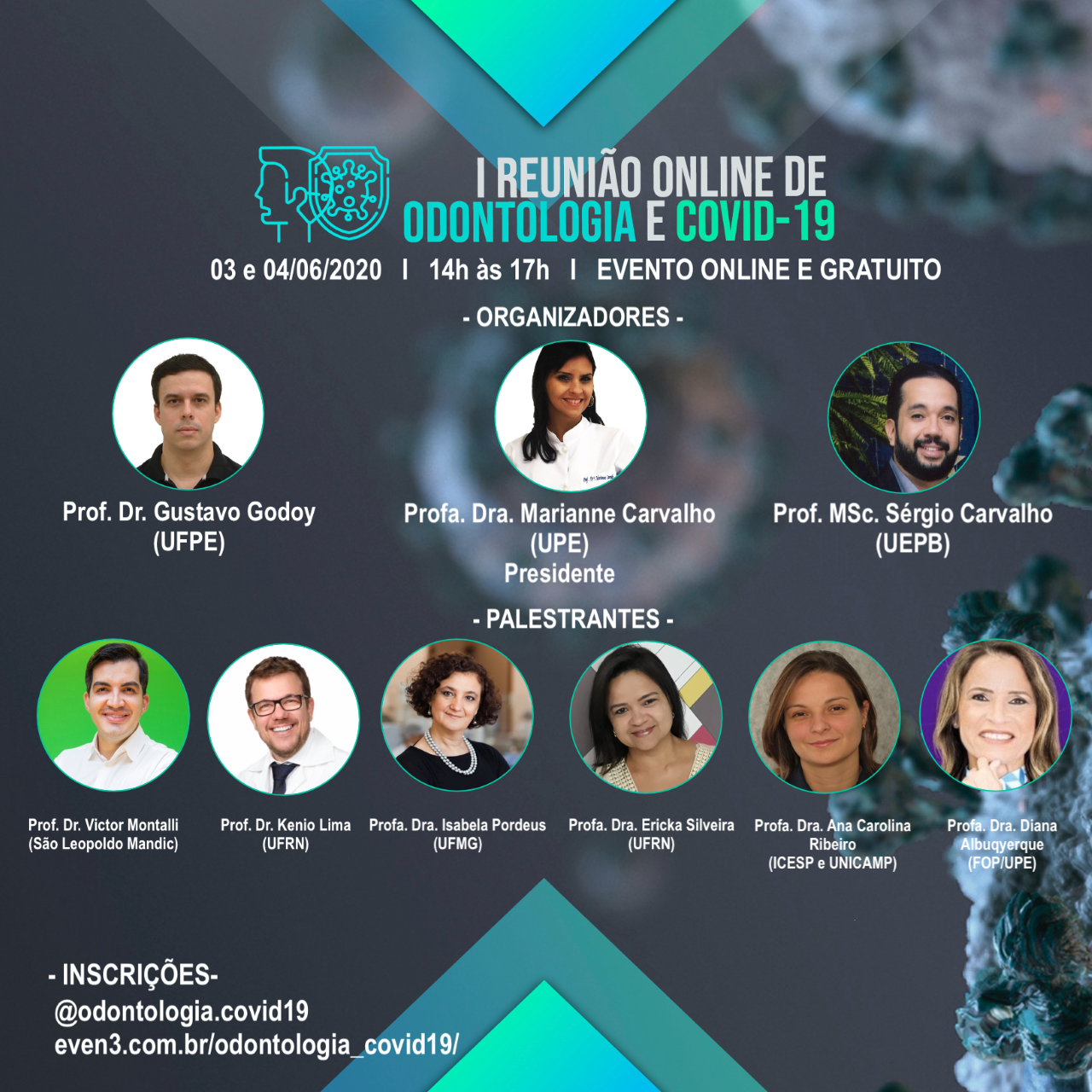 Nos dias 3 e 4 de junho, professores da Universidade Estadual da Paraíba (UEPB), da Universidade de Pernambuco (UPE) e da Universidade Federal de Pernambuco (UFPE) promovem o 1º Encontro On-line de Odontologia e Covid-19”. Estão à frente desta iniciativa o professor Sérgio Carvalho, do Curso de Odontologia do Câmpus VIII da UEPB; a professora Marianne de Vasconcelos, docente de Odontologia do Câmpus de Arcoverde da UPE e vice-coordenadora do Programa de Pós-Graduação da FOP; e o professor Gustavo Pina Godoy, docente do Curso de Odontologia e do Programa de Pós-Graduação de Odontologia da UFPE.