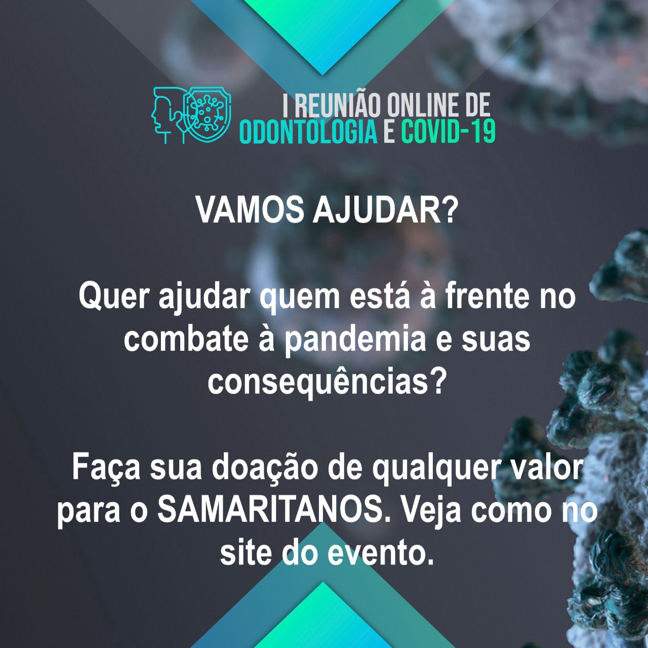 O evento é 100% virtual, gratuito, com certificação e participação de palestrantes de vários lugares do Brasil. O objetivo é tentar elucidar os principais questionamentos da Odontologia relacionada à Covid-19 e ajudar a classe odontológica a atuar de forma mais segura. O intuito também é ajudar a organização Samaritanos Recife (@samaritanos.recife) que está trabalhando nas consequências da pandemia.