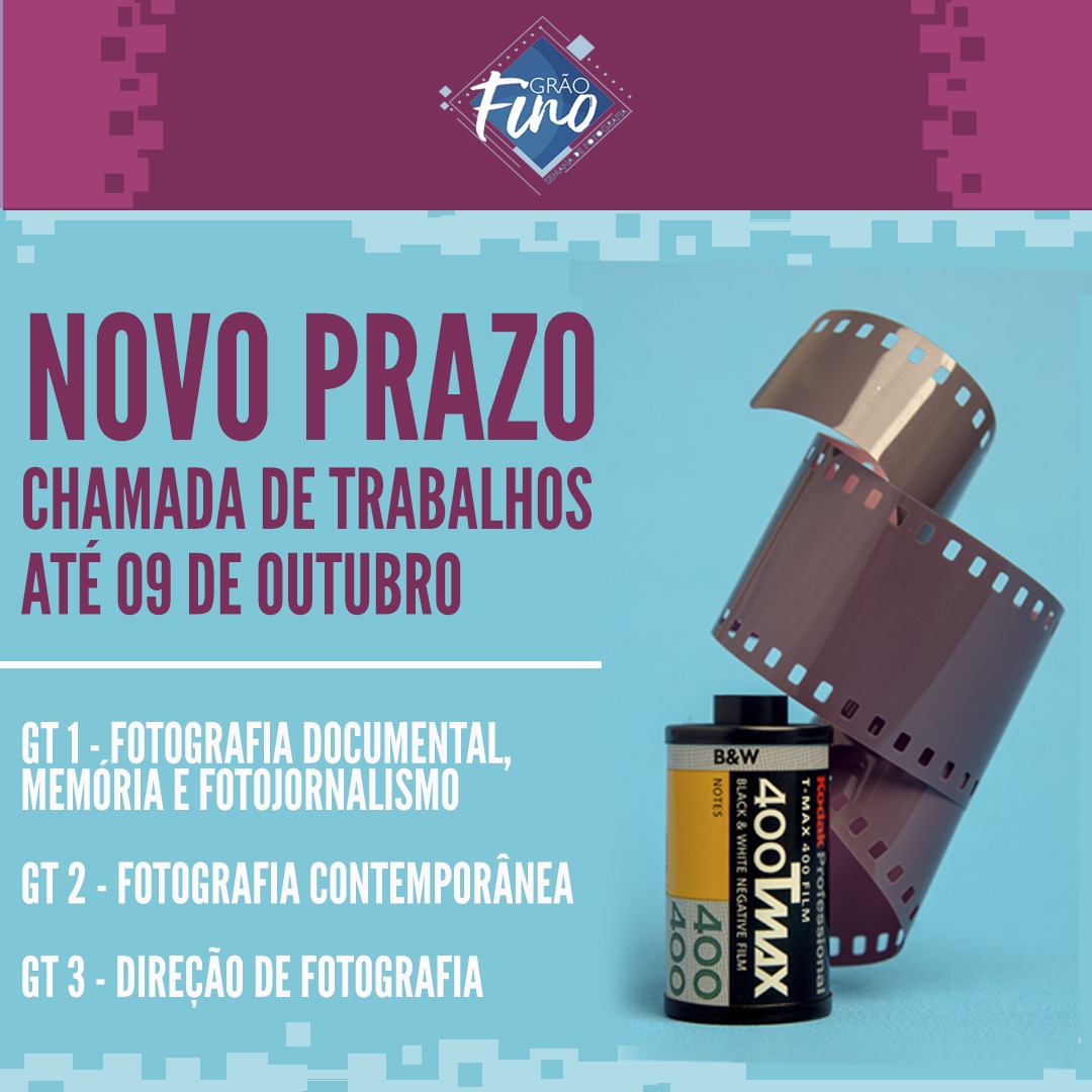 A Comissão Organizadora da “3ª Grão Fino: Semana de Fotografia” decidiu prorrogar o prazo da chamada de trabalhos. Os pesquisadores, professores e estudantes que tenham trabalhos sobre fotografia poderão enviar seus artigos até o dia 9 de outubro. Todo o processo de inscrição e envio dos trabalhos pode ser feito via internet, através do site www.graofinofoto.com.br , clicando na opção “Inscrições 2020”.