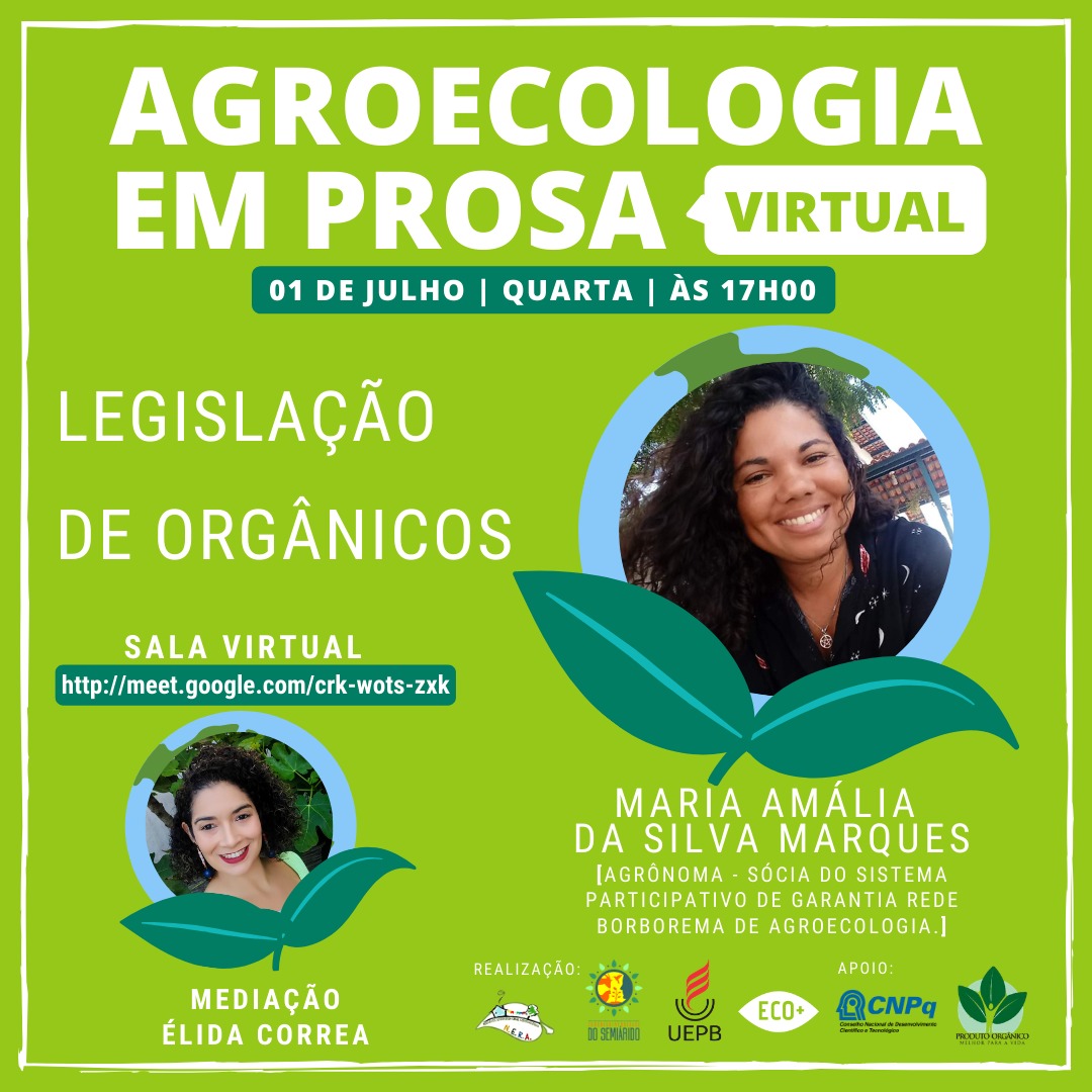 Os projetos aos quais a ação está vinculada são coordenados, respectivamente, pelas professoras Shirleyde Santos e Élida Correa. Nesta quarta, às 17h, o tema debatido será “Legislação de orgânicos”, com Maria Amália da Silva Marques, agrônoma, sócia do Sistema Participativo de Garantia Rede Borborema de Agroecologia. A discussão acontece por meio de sala virtual no Google Meet, acessível no endereço http://meet.google.com/crk-wots-zxk, com mediação da professora Élida Correia.