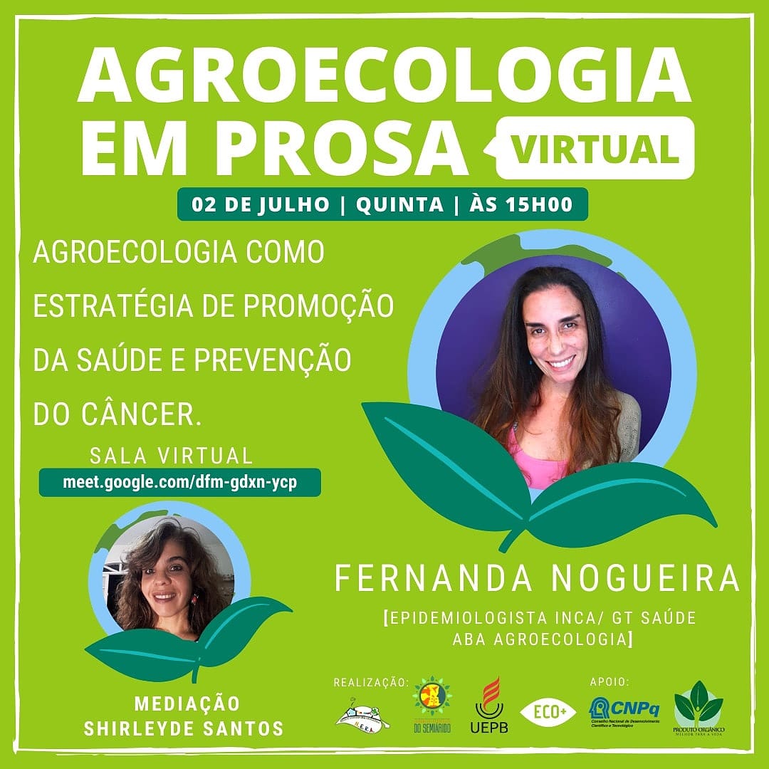 Já na quinta (2), às 15h, o tema apresentado será “Agroecologia como estratégia de promoção da saúde e prevenção do câncer”, com a epidemiologista Fernanda Nogueira, que também é pesquisadora do INCA, na Área Técnica Ambiente, Trabalho e Câncer e membro do GT Saúde e Agroecologia da ABA. A atividade será desenvolvida em sala virtual do Google Meet, acessível no endereço http://meet.google/dfm-gdxn-ycp, com mediação da professora Shirleyde Santos.