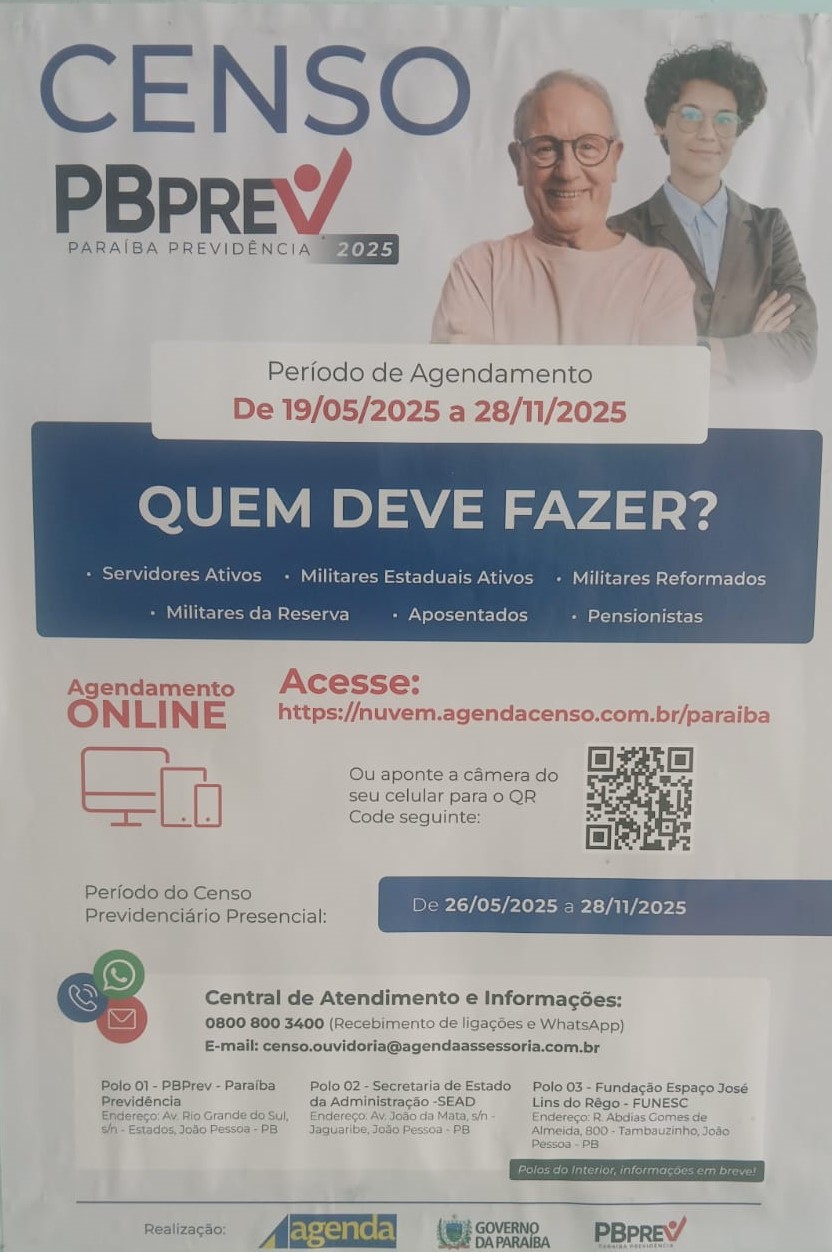 A PBPREV disponibilizou dois postos de atendimento presencial para realização do Censo Previdenciário 2025 em Campina Grande. O servidores estaduais (ativos, aposentados, pensionistas e militares) já podem fazer o agendamento on-line por meio deste link disponibilizado para os seguintes locais: Terminal Rodoviário de Campina Grande (Rodoviária Nova); e Escritório de Representação do Estado (R. Benjamin Constant, 146 – Estação Velha).