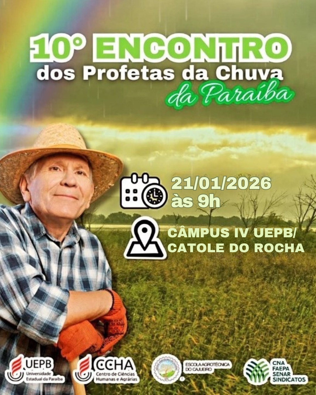 Por mais um ano, o Centro de Ciências Humanas e Agrárias (CCHA) da Universidade Estadual da Paraíba (UEPB) recebe o Encontro dos Profetas da Chuva da Paraíba. Esta 10ª edição acontece na quarta-feira (21), às 9h, no Auditório do Câmpus VI, localizado em Catolé do Rocha. Será mais uma oportunidade para a troca de experiências entre o homem e a mulher do campo em um evento que é referência nos estudos sobre o tempo e a valorização do conhecimento popular.