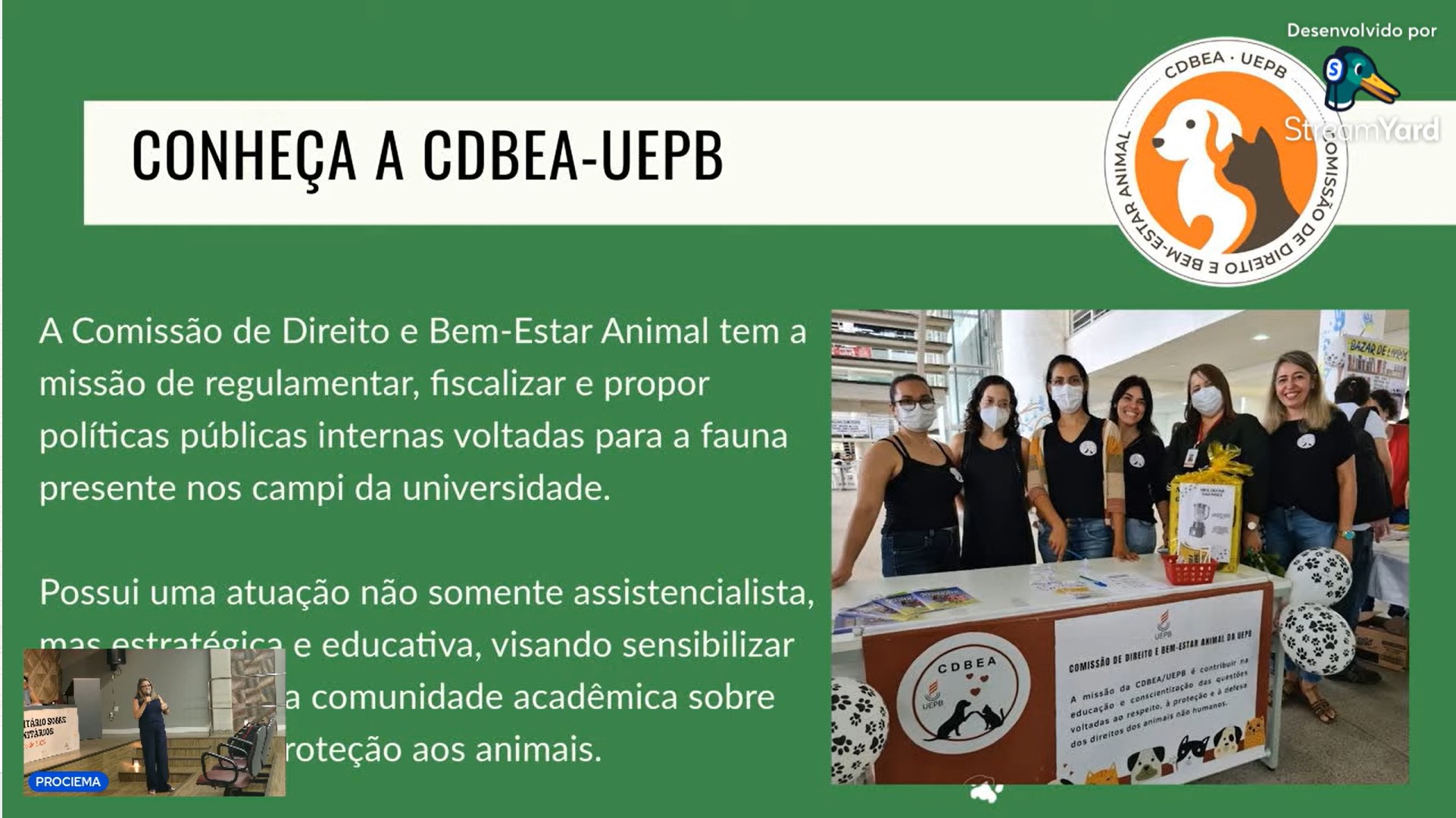 Representada pela coordenadora da CDBEA, Lucia Medeiros, o encontro proporcionou a troca de experiências entre instituições de ensino superior que tem a pauta animal como parte de suas políticas públicas institucionais. Luciana Medeiros apresentou a atuação da CDBEA nas ações desenvolvidas na universidade quanto aos cuidados e a proteção dos animais comunitários dos oito câmpus da UEPB, reforçando a importância da comunidade acadêmica no envolvimento dessas ações para prevenção de abandono e maus-tratos. Como também ações que tratam sobre a guarda responsável e o manejo ético desses animais.