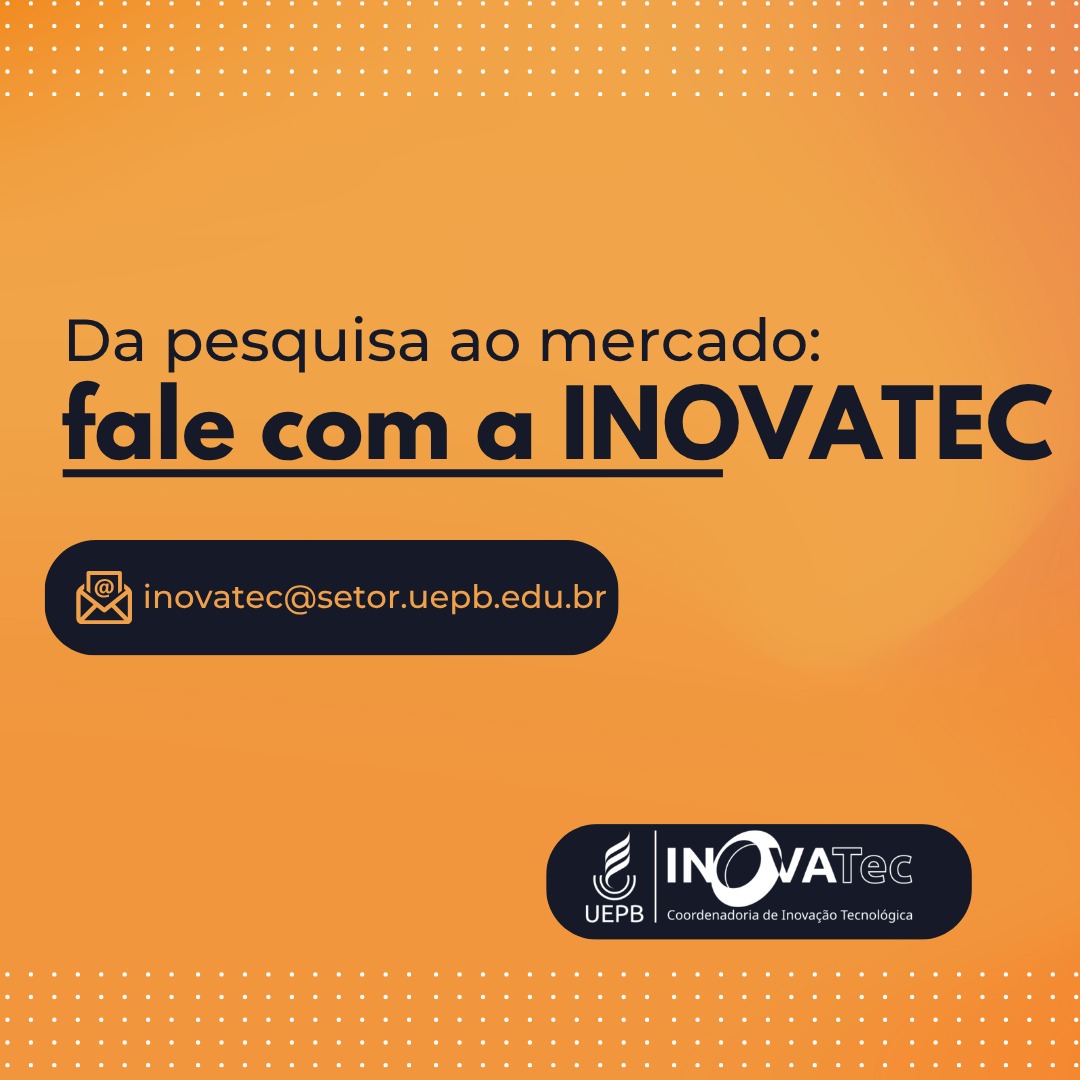 A Coordenadoria de Inovação Tecnológica (Inovatec) da Universidade Estadual da Paraíba (UEPB) informa que todas as ações relativas à propriedade intelectual, transferência de tecnologia e negociações com empresas interessadas nas soluções e inovações desenvolvidas pela Instituição, devem ser tratadas exclusivamente por meio da Coordenadoria de Inovação.