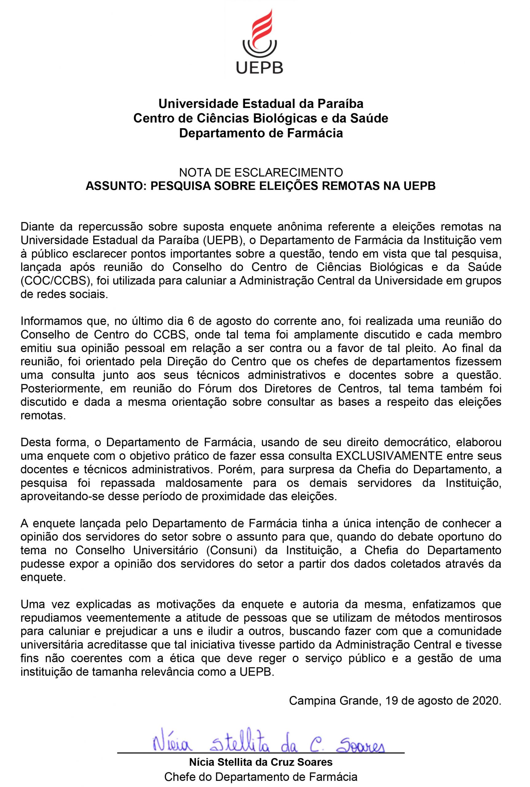 Após repercussão em grupos de redes sociais sobre pesquisa referente à possibilidade de realização de eleições remotas na Universidade Estadual da Paraíba (UEPB), a Chefia do Departamento de Farmácia da Instituição emitiu nota de esclarecimento para esclarecer questões como autoria e objetivo da enquete que, conforme a nota, foi idealizada após reunião do Conselho do Centro de Ciências Biológicas e da Saúde (CCBS), no último dia 6 de agosto, e do Fórum dos Diretores de Centro.