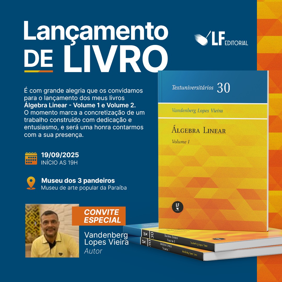 O Departamento de Matemática, do Centro de Ciências e Tecnologias (CCT), Câmpus I, da Universidade Estadual da Paraíba (UEPB) promoverá, no dia 19 de setembro, das 19h às 22h, no Museu de Arte Popular da Paraíba (MAPP), o lançamento dos livros “Álgebra Linear – Volume 1” e “Álgebra Linear – Volume 2”, de autoria do professor Vandenberg Lopes Vieira.