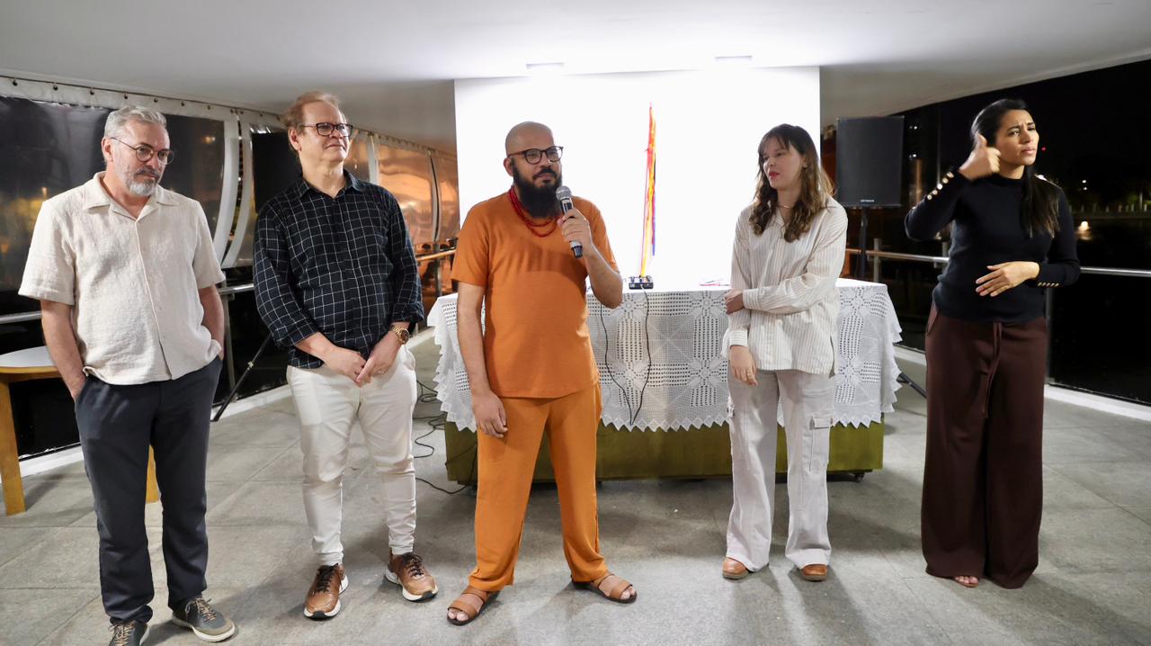 “Fora de Mim Outro Lugar” teve vernissage na noite da quinta-feira (23). Participaram da oportunidade, a intérprete de Libras Jéssica Santos e a DJ FlôCore. A mostra apresenta 25 obras, propondo uma junção entre a arte popular e a contemporânea, percorrendo temas como dança, memória e folguedos. A curadoria é de Alisson Nogueira. “Brincantes Boi” e “Jaraguá”, feitas em aquarela sobre papel algodão, “Passagem 3”, que congrega materiais como cerâmica, tecido, vidro, metal, aviamentos e cera, e “Zé Ninguém nº2”, composta de papelão, tecidos e aviamentos, perfazem a exposição.