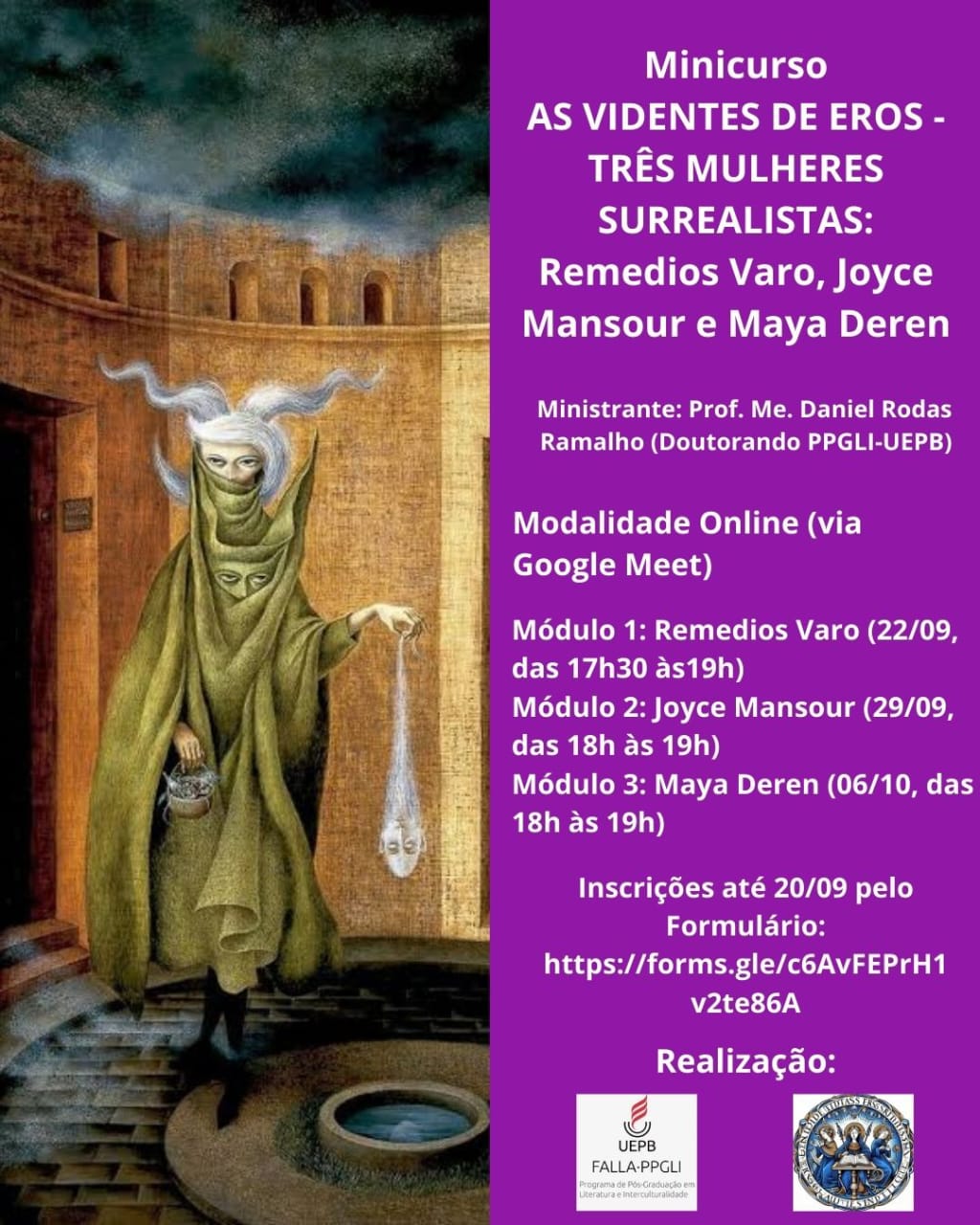 Figuras femininas que se relacionam com o tema do amor e do desejo, personificado pela deusa Eros, serão analisadas, em um contexto artístico e literário, durante o minicurso “As Videntes de Eros – Três mulheres surrealistas (Remédios Varo, Joyce Mansour e Maya Deren)”. A atividade é promovida pelo Grupo de Pesquisa “Benditas Escritas Transgressoras”, do Programa de Pós-graduação em Literatura e Interculturalidade (PPGLI) e da Faculdade de Linguística, Letras e Artes (FALLA) da Universidade Estadual da Paraíba (UEPB).
