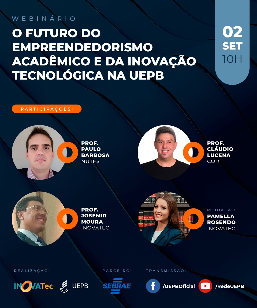 Com vistas ao empreendedorismo e estratégias para criação de uma incubadora de negócios, a Agência de Inovação Tecnológica (Inovatec) da Universidade Estadual da Paraíba (UEPB) realiza, no dia 2 de setembro, às 10h, a palestra virtual “O futuro do empreendedorismo acadêmico e da inovação tecnológica na UEPB”. A atividade conta com apoio do Sebrae e terá as participações dos professores Josemir Maia (Inovatec), Cláudio Lucena (CoRI) e Paulo Barbosa (Nutes), todos da UEPB, sendo mediada por Pamella Rosendo (Inovatec).