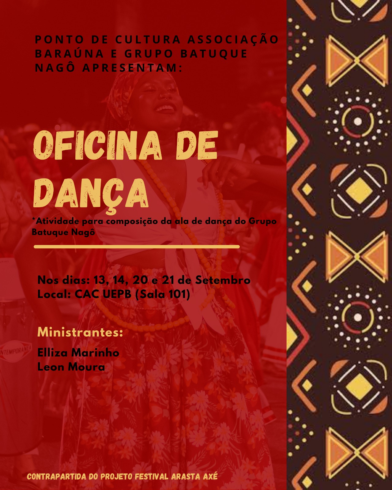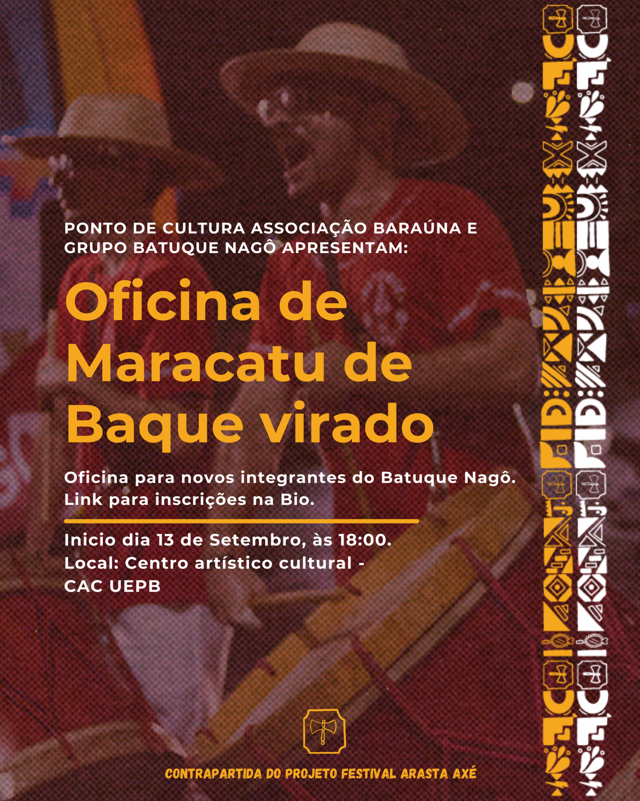 O Centro Artístico Cultural (CAC) da Universidade Estadual da Paraíba (UEPB), em Campina Grande, sediará diversas atividades da Associação Cultural, Educacional e Social Baraúna. Nesse sentido, estão abertas as inscrições para duas oficinas, sendo de Dança e Percussão (Maracatu de Baque Virado), ambas gratuitas. As atividades integram o Projeto Festival Arrasta Axé, que busca valorizar a cultura popular e negra, servindo como espaço de formação e conhecimento.