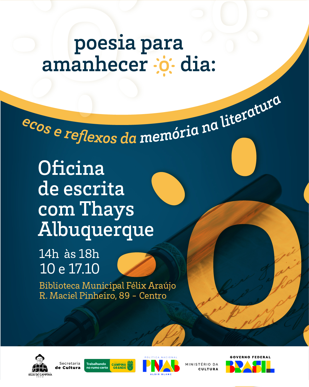 O processo será guiado por técnicas de escrita criativa em um ambiente leve, afetivo e de troca entre os participantes. A oficina conta com financiamento público por meio da Política Nacional Aldir Blanc, através do Edital Biliu de Campina, da Prefeitura Municipal de Campina Grande.