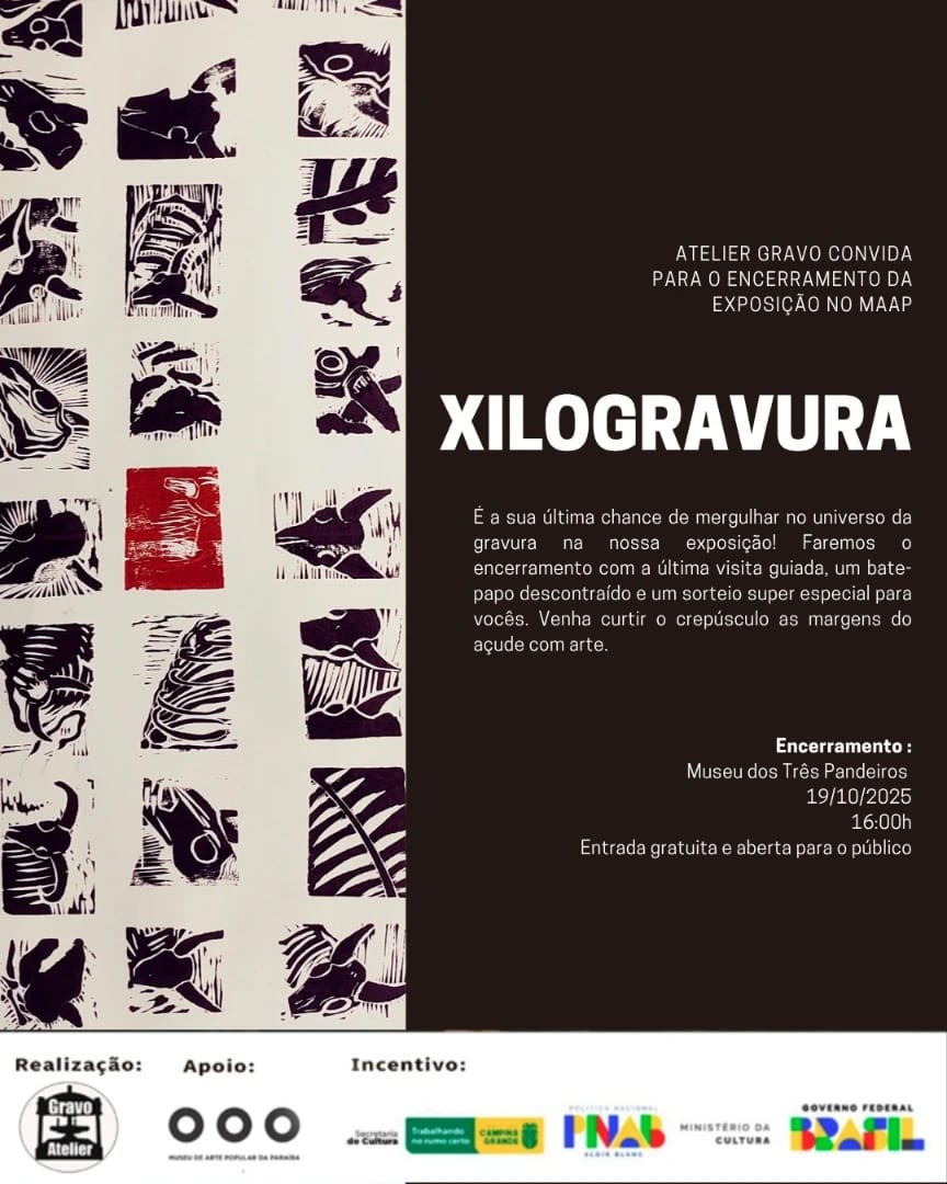 Neste domingo (19), às 16h, o Museu de Arte Popular da Paraíba (MAPP), em Campina Grande, junto com o Ateliê Gravo, promove o encerramento da exposição “Xilogravura”, de Arnilson Montenegro. A entrada é franca.