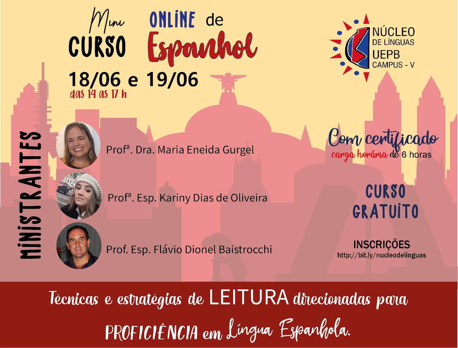 A formação, a ser ministrada pelos docentes do Núcleo de Línguas, Eneida Maria Gurgel de Araújo, Kariny Dias de Oliveira e Flávio Dionel Baistrocchi, contempla o conceito de leitura, assim como técnicas e estratégias utilizadas no ato da leitura em ELE (Espanhol Língua Estrangeira), que possibilitem ao participante realizar uma leitura satisfatória em Língua Espanhola.