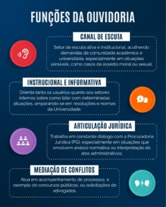 Denúncias envolvendo estudantes são encaminhadas às comissões disciplinares da Universidade. Já as que envolvem servidores, seguem para a Comissão Permanente de Inquérito Administrativo (CPIA). A Ouvidoria, nesse processo, não é responsável por investigar nem punir, mas por garantir que a demanda seja devidamente tratada.