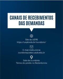 Atualmente, a Ouvidoria disponibiliza os seguintes canais de recebimento: Página do setor, e e-mail institucional ouvidoria@setor.uepb.edu.br. Caso queira, o(a) usuário(a) pode se dirigir pessoalmente à sala da Ouvidoria, localizada no prédio da Administração Central, na escola Redentorista. Em breve, um número de telefone também será divulgado.