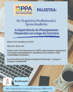 A palestra “Da trajetória profissional à aposentadoria: a importância do planejamento financeiro ao longo da carreira” será proferida no dia 25 de setembro, a partir das 9h, no Auditório do curso de Psicologia, Câmpus I da Universidade Estadual da Paraíba (UEPB), em Campina Grande. A atividade é promovida pelo Setor de Serviço Social da Pró-reitoria de Gestão de Pessoas (PROGEP) e integra as ações do Programa de Preparação para Aposentadoria (PPA) 2025.