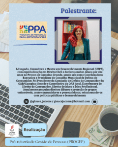 A ação é dirigida a(à) servidores(as) da UEPB, especialmente aqueles(as) em fase pré-aposentadoria, estendendo-se também a toda comunidade acadêmica. A palestrante convidada é Glauce Jácome, advogada, consultora e mestre em Desenvolvimento Regional pela UEPB, com especialização em Direito Civil e do Consumidor. A inscrição deve ser feita por meio deste formulário eletrônico.