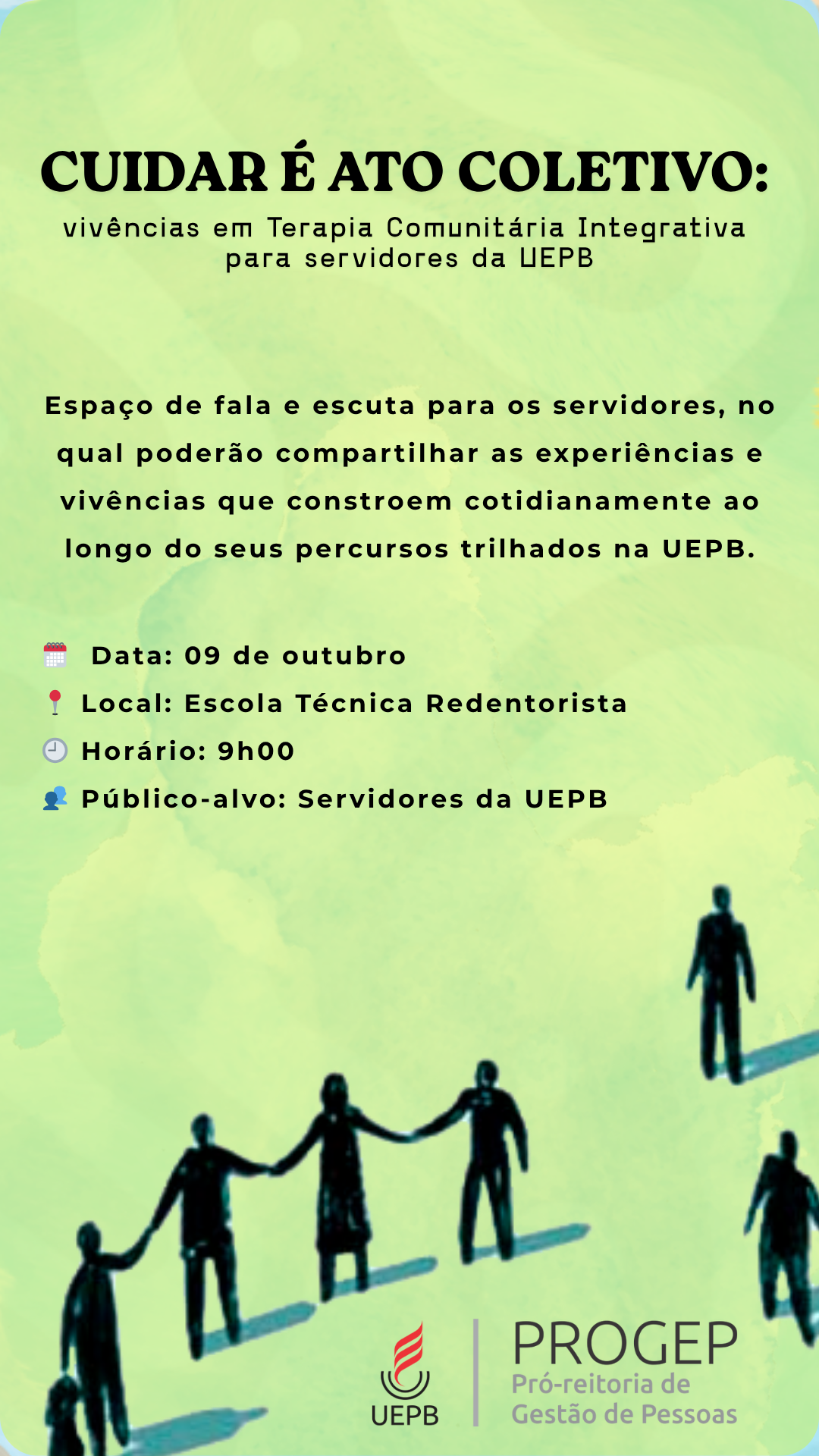 Encerrando as ações do Setembro Amarelo na Universidade Estadual da Paraíba (UEPB), a Pró-reitoria de Gestão de Pessoas (PROGEP) promove, nesta quarta-feira (9), a atividade “Cuidar é Ato Coletivo: uma vivência em Terapia Comunitária Integrativa para servidores da UEPB”, a ser realizada às 9h, na Escola Técnica Redentorista. A atividade acontecerá na sala da Comissão Interdisciplinar de Atenção Integral à Saúde e Segurança do Trabalho (CIAST), em Campina Grande.