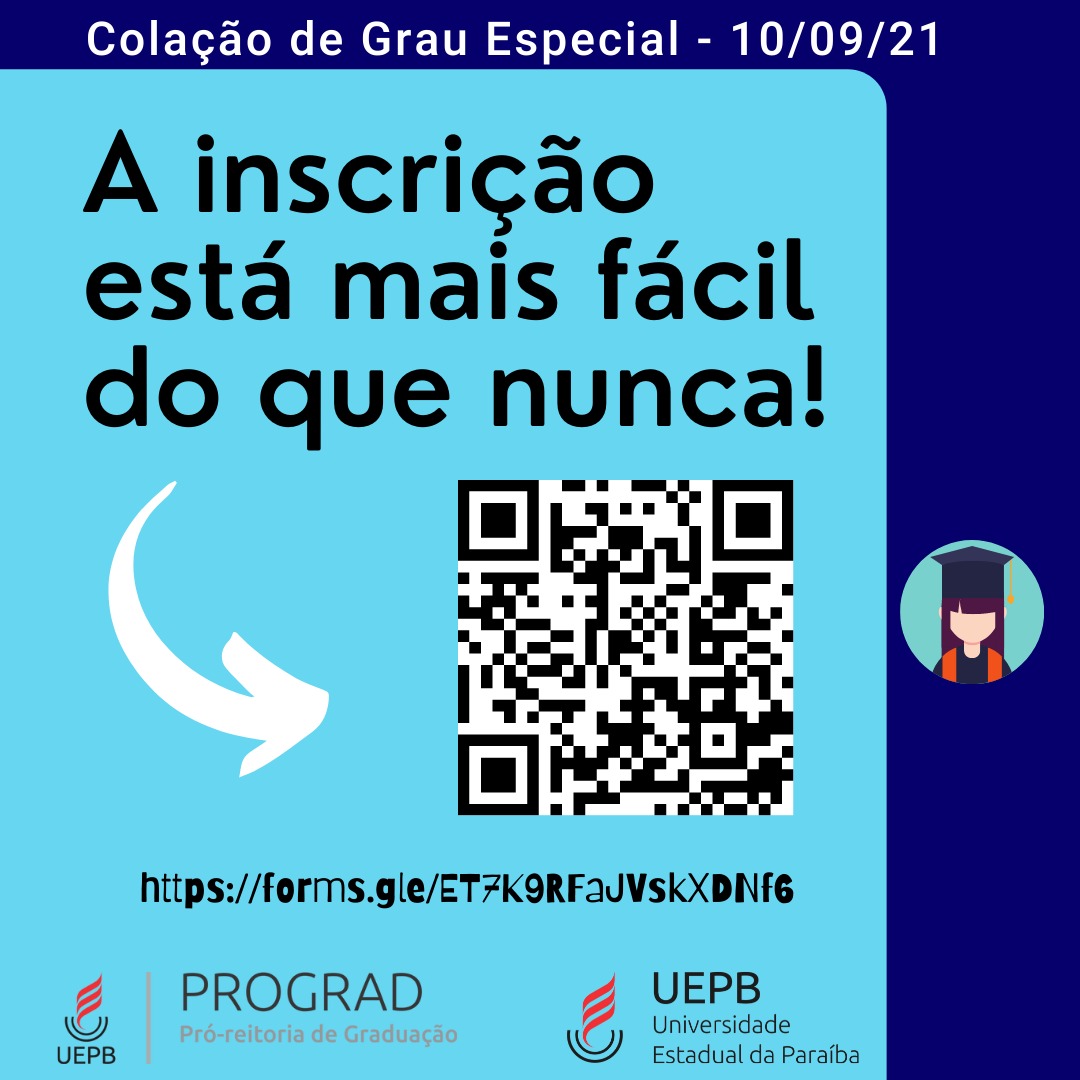 A Pró-Reitoria de Graduação (PROGRAD) da Universidade Estadual da Paraíba (UEPB) está com inscrições abertas, até o dia 30 de agosto, para os formandos interessados em participar da solenidade de Colação de Grau Especial do período letivo 2020/2, que será realizada no dia 10 de setembro, às 10h30. O evento será realizado de forma on-line, com transmissão ao vivo pela Internet através do canal Rede UEPB no YouTube, e pelo Facebook Oficial da Universidade.