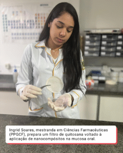 Essa colaboração começa já na Iniciação Científica, quando os alunos são supervisionados por mestrandos, que, por sua vez, podem ser acompanhados por doutorandos, estes eventualmente assistidos por pós-doutorandos. Foi o que ocorreu com Sara Efigênia Dantas de Mendonça y Araújo, atualmente doutoranda do Programa de Pós-Graduação em Desenvolvimento e Inovação Tecnológica em Medicamentos (PPGDITM) da Universidade Federal da Paraíba (UFPB). Ela está no laboratório desde a Iniciação Científica (2020) e vem trabalhando com sistemas de liberação de fármacos e ciência de materiais aplicados à saúde, com foco no desenvolvimento de nanocompósitos, na caracterização de materiais e na avaliação da atividade antifúngica.