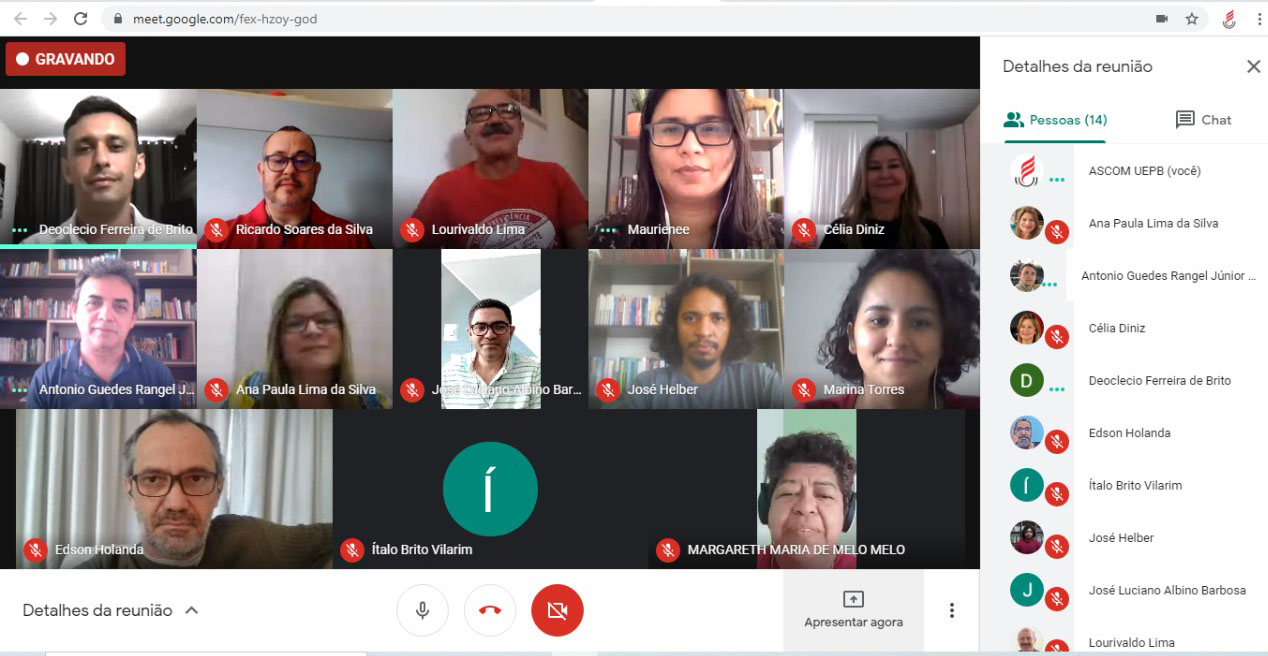 Durante a reunião virtual, a presidente da ADUEPB, professora Mauriene Freitas, apresentou uma pauta de reivindicações da categoria docente, fruto de Assembleia Geral realizada no dia 24 de julho, envolvendo o estabelecimento de critérios para carga horária docente, horários e canais específicos para atendimento de alunos, acesso a materiais bibliográficos, suporte psicológico, cursos de capacitação, entre outros pontos voltados ao trabalho realizado de forma remota.