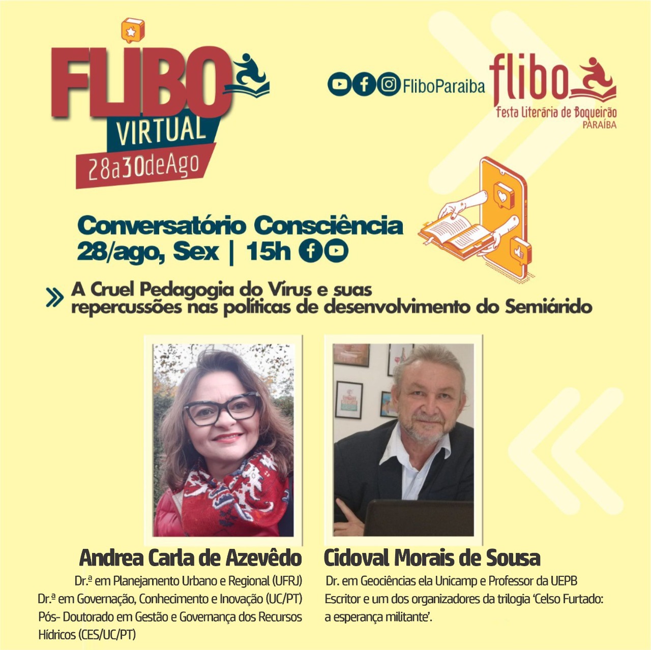 Nesta sexta-feira (28) tem início, de forma on-line, a Festa Literária de Boqueirão (Flibo). A iniciativa conta com apoio da Universidade Estadual da Paraíba (UEPB) e, hoje, às 15h, o professor Cidoval Morais, pró-reitor adjunto de Pós-Graduação e Pesquisa da Instituição participa da atividade “Conversatório Consciência: A cruel pedagogia do vírus e suas repercussões nas políticas de desenvolvimento do Semiárido”, dentro da programação do evento.